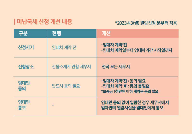 - 전세사기 피해 방지를 위한 임차인 미납국세열람제도 4월 3일부터 시행