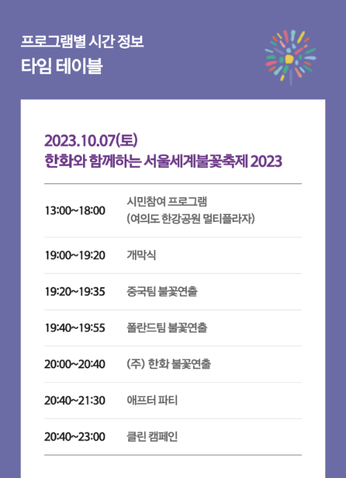 불꽃축제 시작은 저녁 7시 20분 ~ 8시 40분까지 라고 합니다. 정확한 시간은 위의 이미지를 참고 해주시면 됩니다.