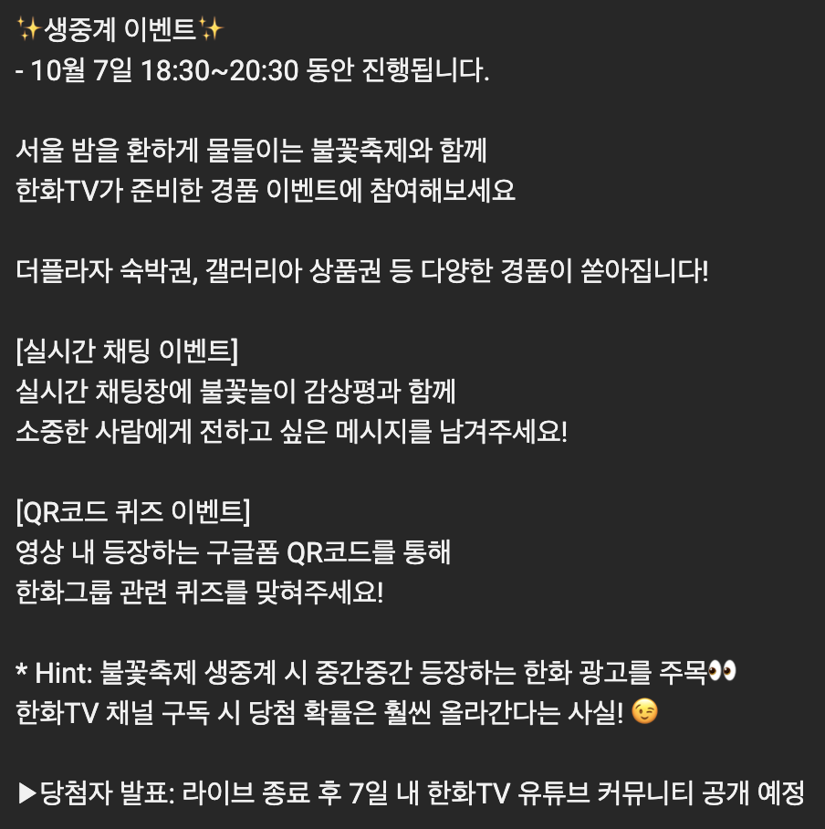 현장에서 관람하기 어려운 분들을 위해서 온라인 생중계도 진행된다고 하니, 참고 하시기 바랍니다. 또한 생중계 동안에는 이벤트도 함께 진행된다고 합니다. 관심있으신 분들은 화려한 불꽃도 감상하시고, 이벤트에도 꼭 참여해보세요 !